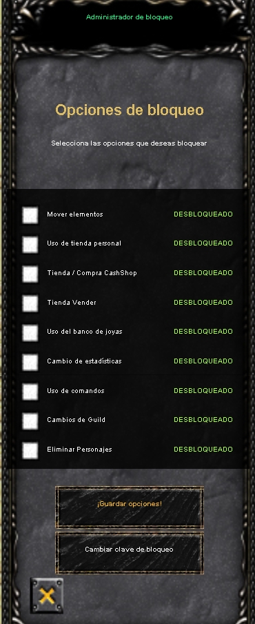 Contamos con un sistema que puede bloquear acciones de nuestros personajes, es muy util para evitar que se desaparezcan o cambien cosas de nuestros pj's cuando prestamos cuentas a amigos, hermanos, primos, etc.