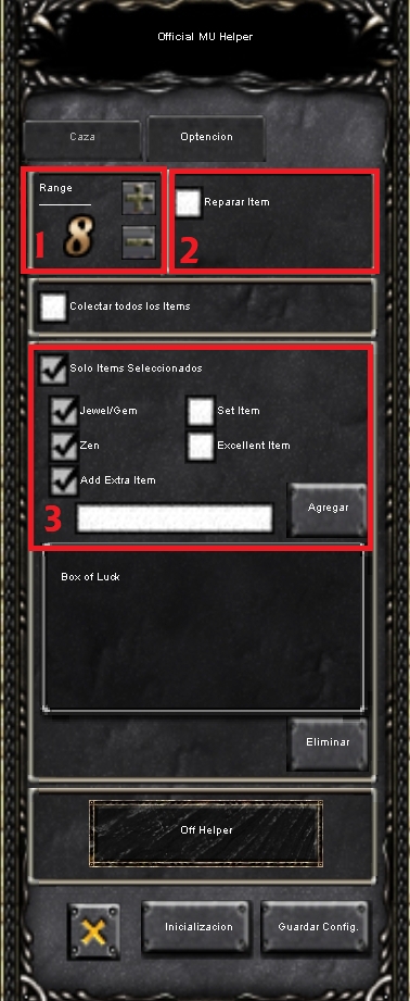 desde #MuHelper podremos configurar todo lo relacionado al PvE, tanto ataque como recoleccion de items especiales y joyas.